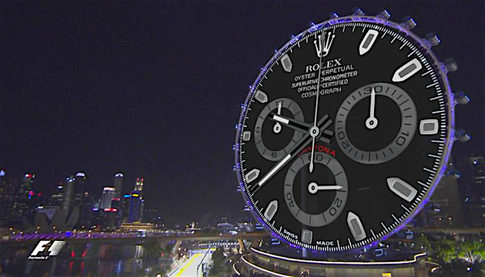 Un enorme Rolex presidiendo la calificación del GP de Singapur. La noria de Marina Bay, una de sus estampas más conocidas, convertida en un reloj gigante gracias a una ingeniosa publicidad: una imagen sobrepuesta digitalmente en el centro de la atracción. Este es un recurso utilizado en cada carrera por la FOM, encargada de la retransmisión única de los grandes premios, en los últimos tiempos.